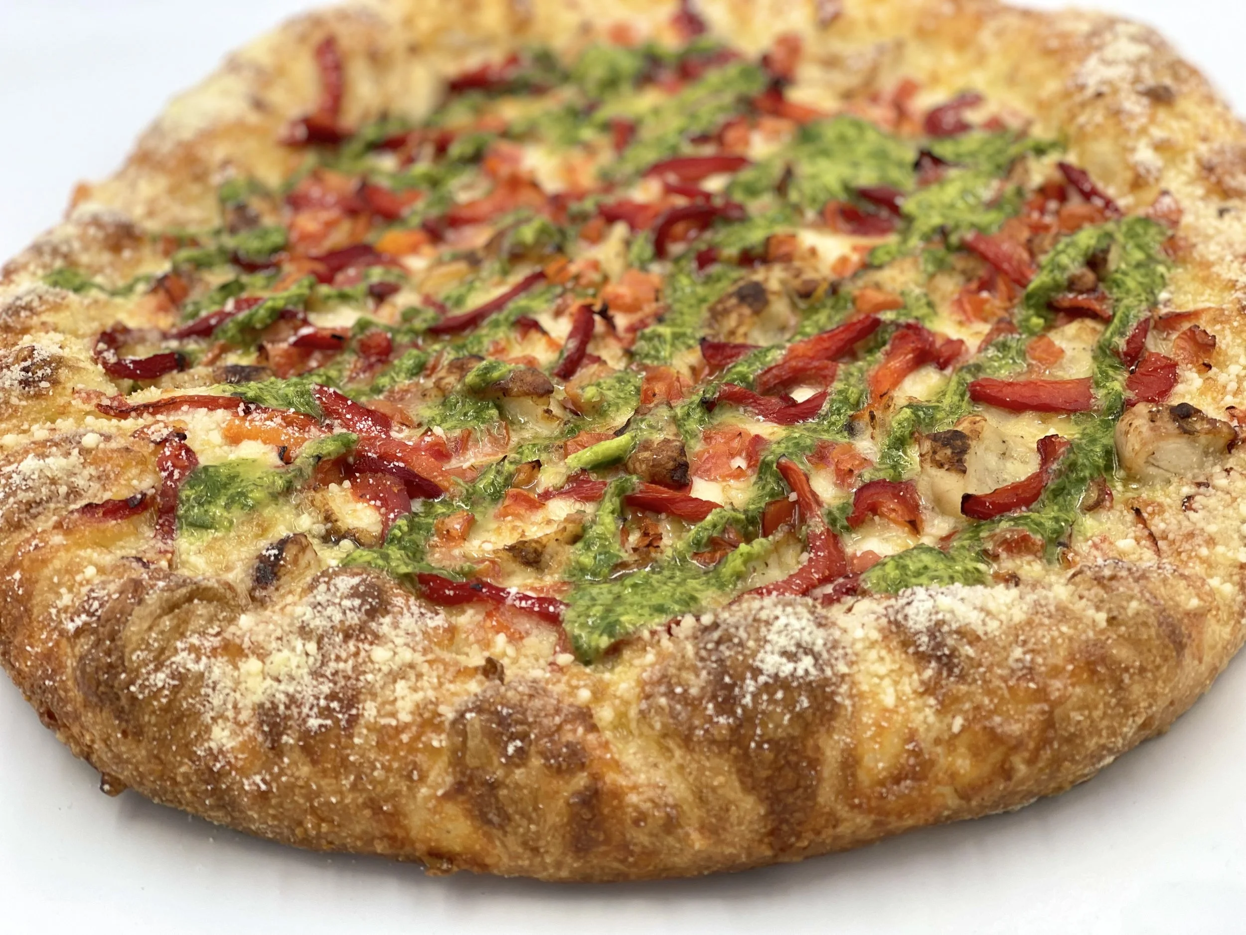 North Pole: Alfredo sauce, chicken, mozzarella cheese, tomatoes, roasted red peppers, then baked. Finished with garlic-parmesean crust and a pesto drizzle.
