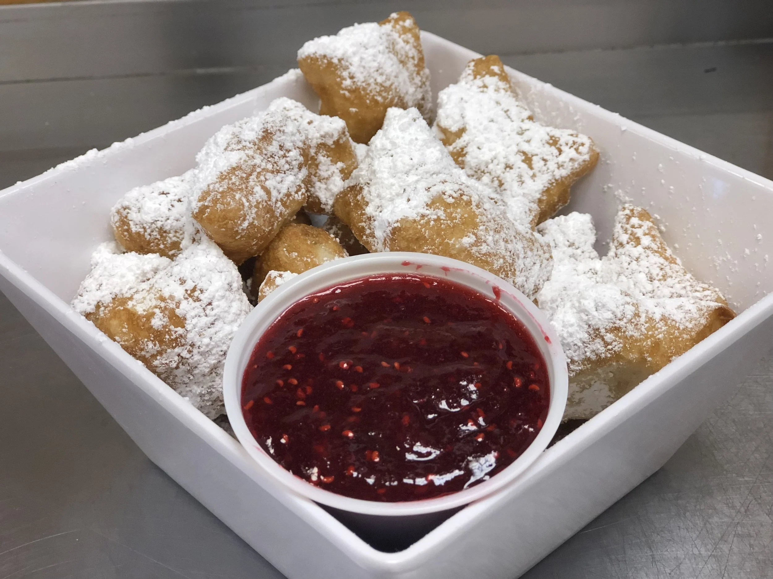 Our tasty house-made dough, fried, tossed in powdered sugar and served with a raspberry-jelly sauce.