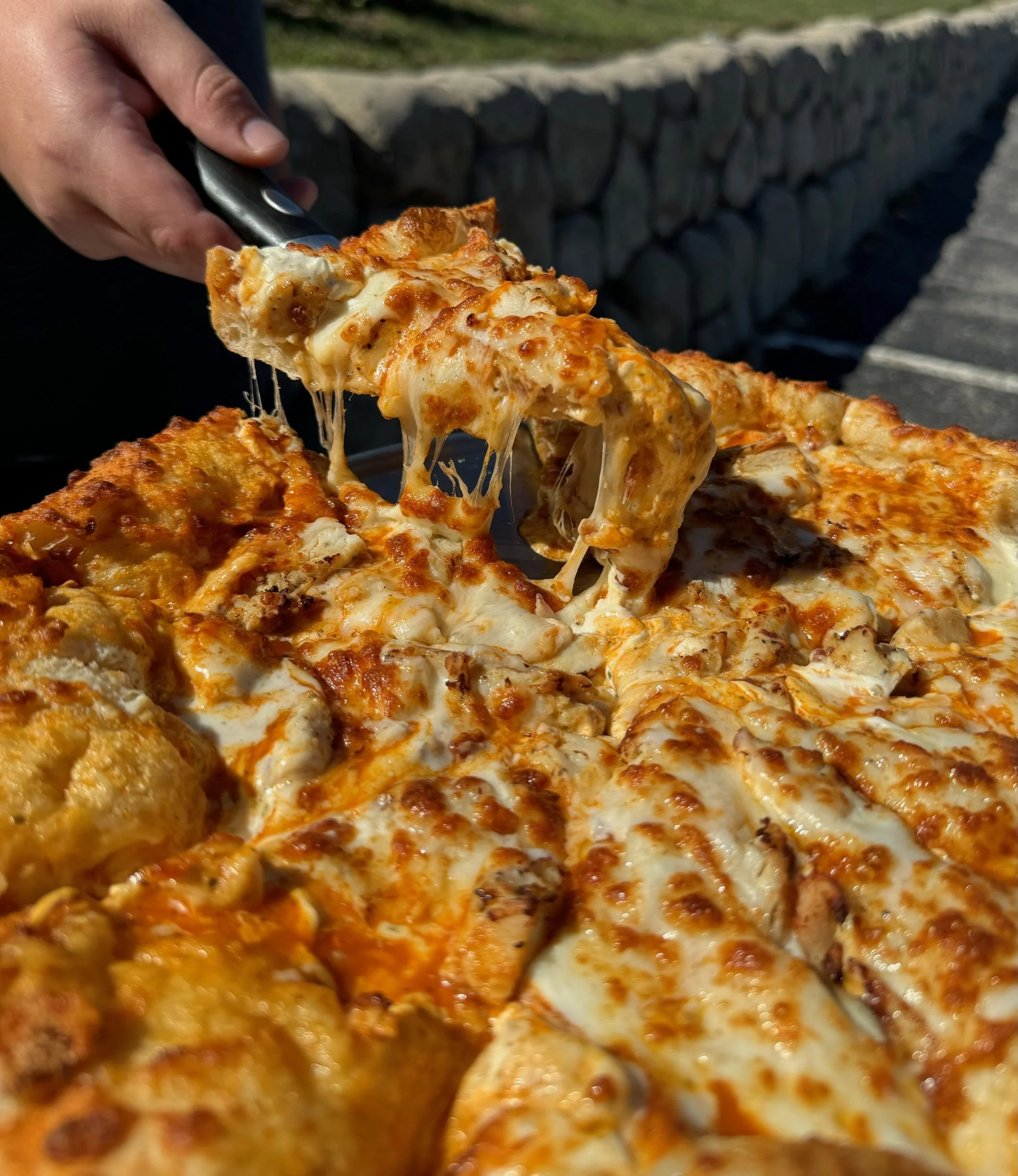 Buffalo Chicken Pizza: Creamy buffalo base, grilled chicken, mozzarella cheese and buffalo seasoned crust