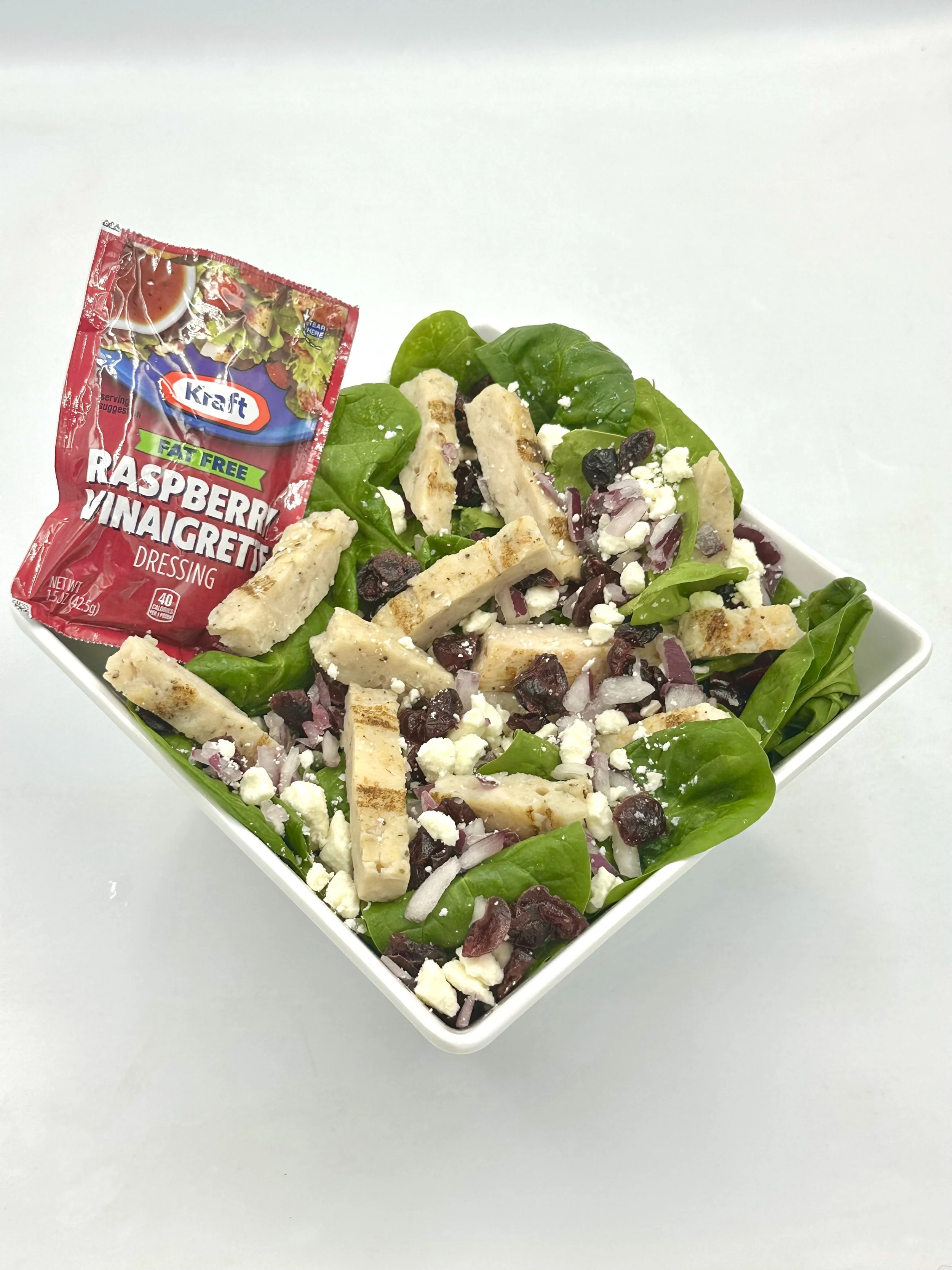 Grilled chicken, diced onions, feta cheese and dried cranberries prepared on a bed of fresh spinach.Served with Raspberry Vinaigrette dressing.